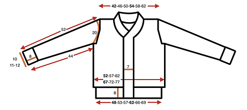 The stated measurements are for a tension of 24 stitches on 10 cm. An example of sizes S-M-L-XL-2XL-3XL is listed, where small is the one knitted and used as example. Use schematic sketch to find measurements in cm for the different sizes. You can use an existing sweater/cardigan to compare what size you want to make. Lengths should be adjusted by the knitter and drawn onto the sketch.
