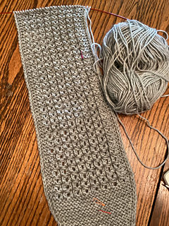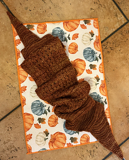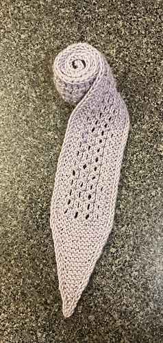 The construction is simple yet satisfying: you’ll begin with a cast-on and a short garter stitch increase section to build your desired width. From there, the scarf flows into the main body, worked in a lace stitch that mimics the look of cables—without ever touching a cable needle. Once you’ve reached your ideal length, you’ll taper back down with neat garter stitch decreases, finishing with a sharp, polished tip. A built-in faux I-cord edge frames the whole piece, giving it a refined finish without any extra work. Stitch count: a multiple of 3 + 10.