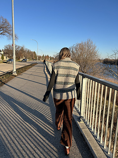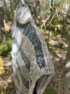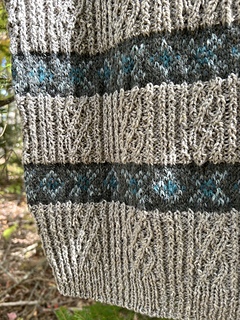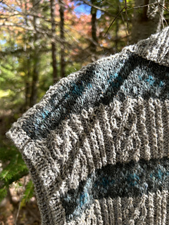 This design took shape at the family woodlot. My husband wanted to get to know our woodlot better by blazing trails through to each boundary. He headed into the bush while I stayed behind to knit. Several hours later, he would emerge, excited about his discoveries. Paths were given meaningful names like Grouse Trail, Fern Trail, Pine Trail, etc. The more I heard about trails, the more I began to see trails in the cables and ribs of my design - hence the title. The “XO” motif symbolizes the “labour of love” that allows us now to stroll the trails and be with nature.