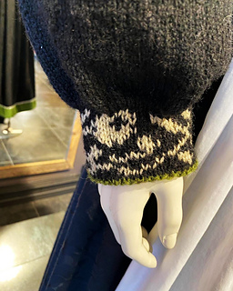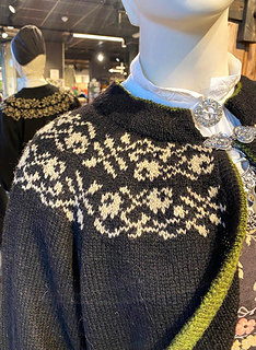 Koften strikkes med grønne tittekanter til bunaden med sort skjørt,