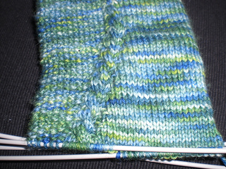 This sock was designed after becoming rather obsessed with the idea of traveling cables, and the way they can move. Add to that obsession another one with Vintage Purls lovely sock yarns and a particular skein of the Gondwana colourway glaring at me from my stash and you get these around the world socks. Really any sock yarn with subtle colour changes would be wonderful, I haven’t tried it but I bet even a stripey colourway would be fab too. Two cables starting along the sides and slowly traveling around to the front where they meet at the middle of the foot before finally exploding off to the sides. No matter what yarn or colour you knit it in these socks will feel like a trip around the world.