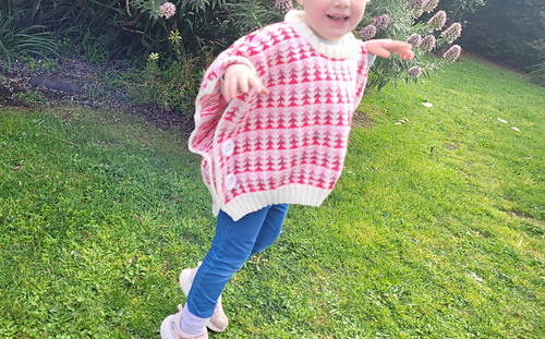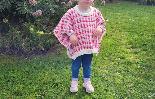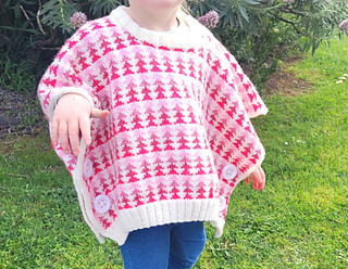 This poncho and hat pattern comes in two easy fitting sizes 2-4 and 6-8 years. It features the treelines pattern, which is a simple two colour, six row pattern. The ribbing uses the knit 2, purl 2 stitch. The only shaping required is around the neckline. A small amount of sewing is needed to slip stitch the neck ribbing in place and attach the over sized buttons. This pattern is suitable for anyone with a good basic level of knitting skills.