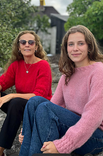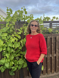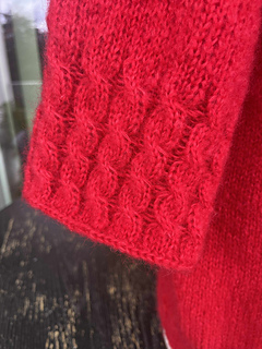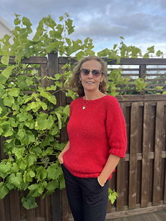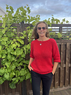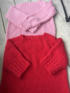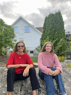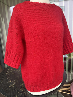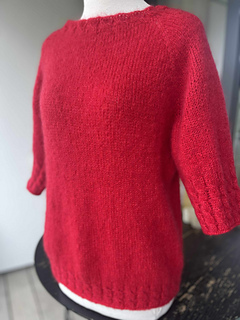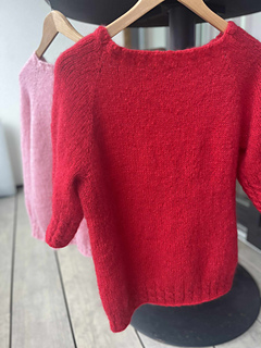 Tresse sweater in double strand Dale Kidsilk Erle. The sweater is knitted top-down with raglan shaping, half-length sleeves, and cable details in the ribbing. The sweater shown in the photo is size S. The pattern is available in 9 sizes