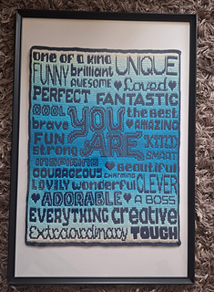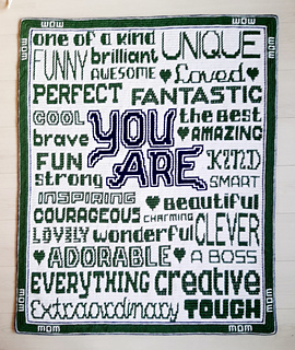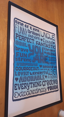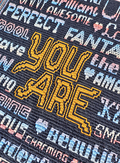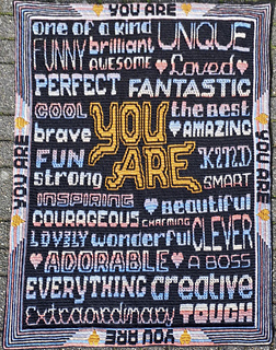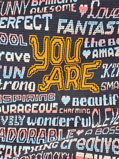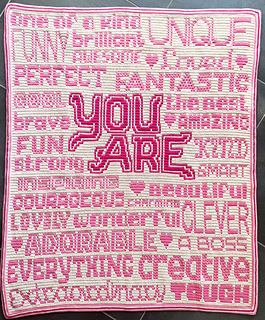 Het patroon bevat instructies waar voor kleur gewisseld kan worden om ‘You are’ in een afwijkende kleur te doen. Dit is zowel in het geschreven patroon als in het telpatroon aangegeven.