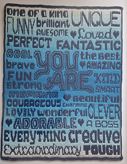 Dit patroon voor een deken vol lovende woorden is gemaakt om te haken in overlay mozaïek techniek.