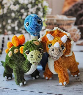 The toy is crocheted in parts. Legs and tail are crocheted directly into the body. Head is attached using a cotter pin or plastic joint. Mouth, horns, belly, and spots are sewn on.
