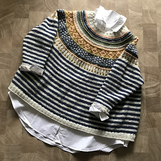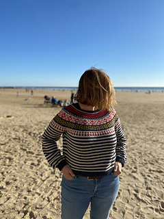 Inspired by the bright stripy tents and architectural details found in my favourite local seaside town, Trouville-Sur-Mer, in Normandy. Seamless and knit in the round from the top down, it was designed as a cropped cardigan that can be worn with the buttons down the front OR the back, but it can easily be made as a simple sweater as well, just don’t knit the steek stitches and add short rows at the back neck. You can also easily tailor the length to suit your preference. Textural details include occasional rows of purl stitch as well as small bobbles around the neckline and cuffs.