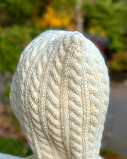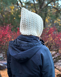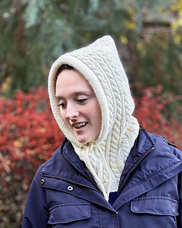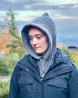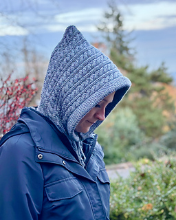 Knit in the round from the bottom up, the shaped cowl transitions seamlessly to the hood with a simple split under the chin. From there, it’s worked flat while continuing the easy cable pattern. Thoughtful decreases round the point of the hood and create a clean finish at the back. The top of the hood is joined with a fuss-free 3-Needle Bind Off.