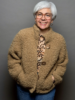 »Tschilly«-Cardigan hat einen doppelten warmen Stehkragen und praktische Seitentaschen. Ich habe die Jacke in einer Blockstreifen-Variante entworfen, bei der in der Passe glitzernde Pailletten mit eingestrickt werden. Der kurze Cardigan hat einen klassischen karamellfarbenen Look, damit er zu vielen herbstlichen und winterlichen Farben kombiniert werden kann.