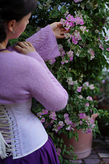Tuberoses blouse is worked from the top down with contiguous sleeves. Stitches are cast on at the neckline and joined in the round. German short rows are worked at the beginning, turning the work to shape the neckline and shoulders. Once the neckline shaping is complete, knitting continues in the round without further short rows. After all shoulder increases have been worked, the sleeves are shaped while the lace pattern is worked on the body.