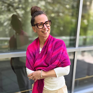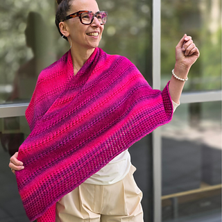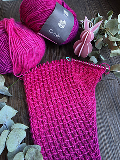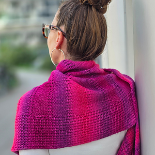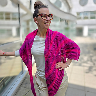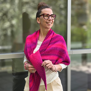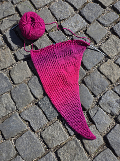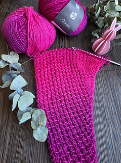 Entlang der geraden Kante verläuft ein einfaches, eingängiges Muster, das sich angenehm stricken lässt und schnell in einen ruhigen Rhythmus führt. In regelmäßigen Abständen wird dieses durch quer verlaufende Streifen unterbrochen und wieder aufgegriffen. So entsteht ein kleines Spiel aus Wiederholung und Variation, das dem Tuch Struktur und Lebendigkeit verleiht.