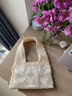 This digital PDF pattern includes written instructions and detailed charts to guide you step by step. The bag is worked from the bottom up, with a structured rectangular base, symmetrical tulip panels, shaped handles, and decorative edging.