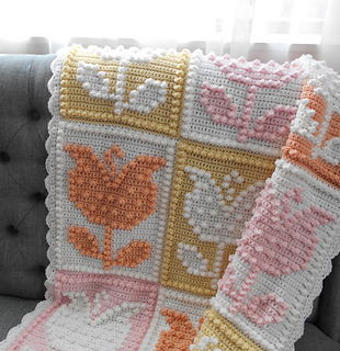 The pattern includes row-by-row written instructions for each individual piece, charts for each individual piece, the chart to complete the blanket in one piece, so you can select the method you prefer. It also includes a list of materials, links to our Youtube videos, and yarn amounts needed for a finished blanket approximately 33” x 44”.