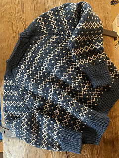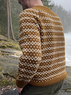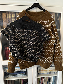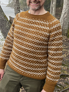 Genser strikket ovenfra og ned uten montering. Halsen er formes ved hjelp av forkortede rader (vendepinner) . Denne genseren har raglanøkning, klassisk fasong og fine, enkle mønsterborder som pryder bol og ermer.