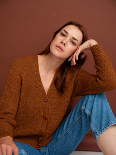 The cardigan begins by casting on stitches for the back of the neck to begin the button band. The button band is worked back and forth in rows, then stitches are picked up along the edge for the back, sleeves and front. Compound raglan shaping is worked using stitch texture over the yoke, while continuing the button band throughout. Once the sleeves are split off, the body is worked in the same texture. Finally the sleeves are worked to complete the cardigan.