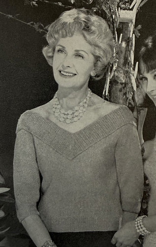 The magic of tinsel makes these tops perfect for party glamour. For the older party-goer the wide vee-necked top with dolman sleeves is a perfect choice. It is knitted in one piece from cuff to cuff and the ribbed neckband is studded with tiny crystal beads.