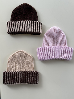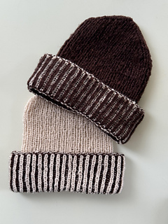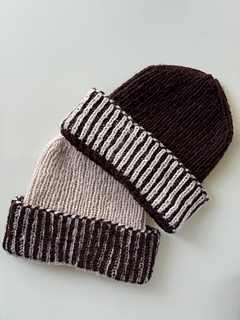 Twin Brim Hat is a modern, reversible beanie with a bold visual impact. The wide brim is worked in two-colour brioche, to create a graphic contrast that flips when the hat is worn inside out- offering two distinct looks in one design.