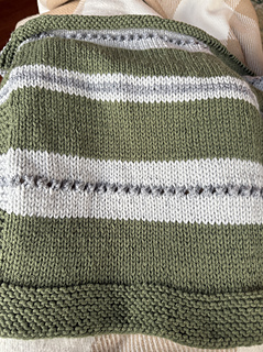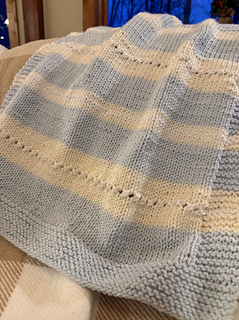 The pattern creates a soft, gently textured baby blanket with wide, cozy stripes and light sparkly eyelet detail that adds dimension without being difficult to work. The finished fabric has a lovely drape and feels substantial yet soft.
