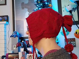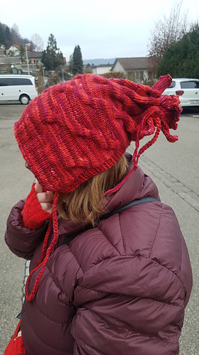 Really multifunctional and versatile garment. It’s a beanie, a bonnet and a cowl. Wear it any way you want! Leave the pom-poms out or make more!