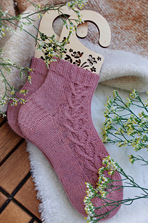 The Twisted Hearts Socks are worked cuff-down, featuring a modified Celtic Hearts cable pattern, on the outer edge of the foot. The placement is different on both socks.