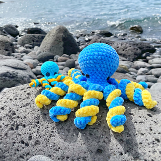 The size of finished item depends on the tension, yarn and hook you use. If you use the yarn and hook indicated (chenille yarn “YarnArt Dolche” or “Himalaya Dolphin baby”), the Octopus will be about 10 cm (4 inches) height.