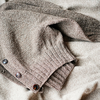 衿ぐりから編み始め、後ろ衿下がりを作りながら首元を形作った後、変形ラグランでヨークを編み進めます。袖を分けた後、裾のリブまで往復編みで仕上げ、袖は輪編みで編みます。最後に、前立てから拾い目をして、1目ゴム編みの前立てを編みつけながらボタンホールを作っていきます。