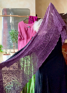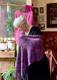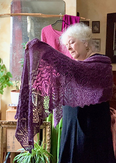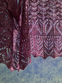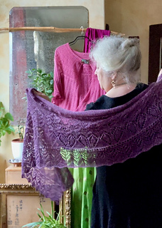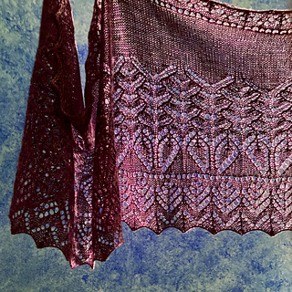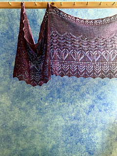 A rectangular shawl, the entire length is knit horizontally in one piece. The top and bottom edgings have plain wrong side rows. The larger section of lace has patterning on both right and wrong sides, following which is a section of plain stockinette.