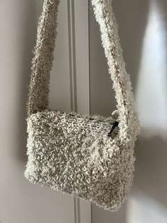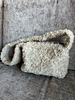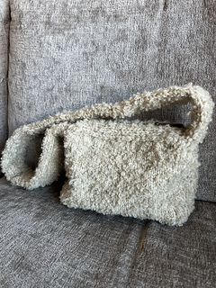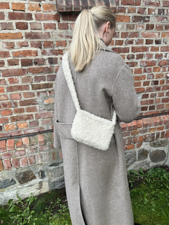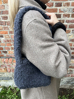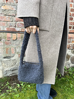 The Ulla Bag is a small, sleek bag with a modern design. The bottom, top, and strap are worked in double knitting, while the body is knitted in stockinette stitch. It closes with a zipper at the top.