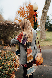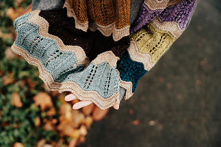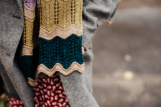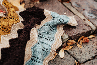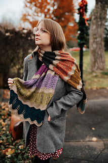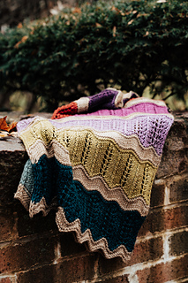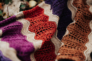 Long rectangular wrap knit from end to end. Worked flat, alternating between the main color and the 12 contrasting colors. Uses yarnovers and decreases to create nature inspired lace motifs. Pattern creates zig-zig stripes, enhanced through final blocking.