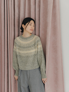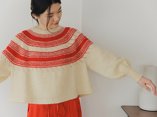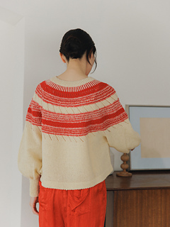 衿からぐるぐると輪で編むトップダウンの形。衿元はねじり1目ゴム編みを編みます。ヨークははじめに1目ずつの編み込み模様を編んだ後、表目と裏目、かけ目と2目一度をリズムよく編んでいきます。一見複雑そうに見える柄ですが、シンプルな編み方でポコポコ感やレース模様を表しています。