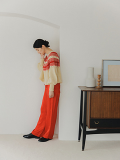 裾の数段前にかけ目と2目一度の模様編みを入れ、裏側にダブルになるようにたたんでかがりつけることで模様編み部分が端になり、細かくスカラップした裾の形に。切りっぱなしのような動きのある裾は、丈を短めにしているので、バランスよくボトムスに合わせることができます。