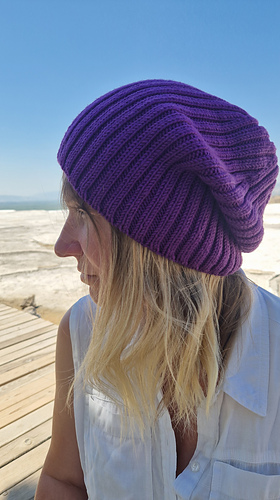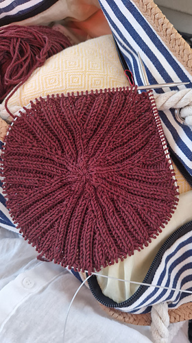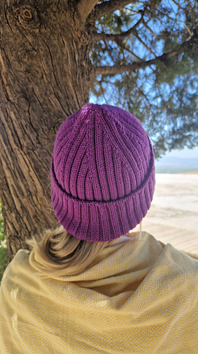 Die Mütze wird von oben nach unten im Rippenmuster 2×2 gestrickt.