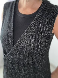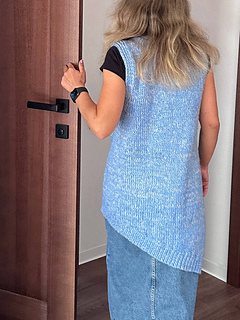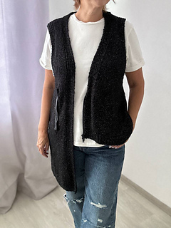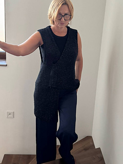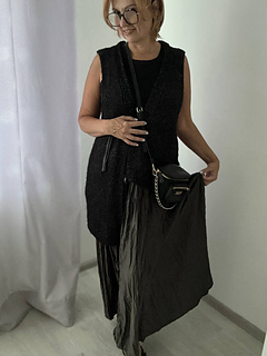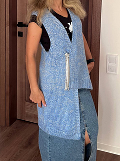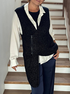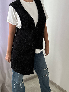 The vest is made in a modern minimalist style with an asymmetrical cut and an interesting fastening design. The model has a deep V-neck and a wrap-around fastening with a zipper located vertically along the wrap line. Thanks to this, the vest can be worn both fully closed and semi-open. The fabric is knitted from voluminous yarn with a slight sheen, which gives the product an impressive look and makes it appropriate for both everyday and more elegant looks. The asymmetrical bottom line creates a dynamic silhouette, lengthening the figure, and the loose fit and slightly elongated left shelf add comfort and allow you to combine the vest with clothes of different thicknesses. It looks great with contrasting bottoms and basic tops, creating a stylish multi-layered look.