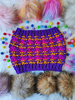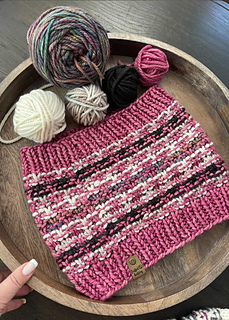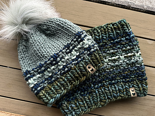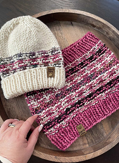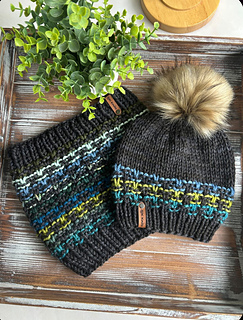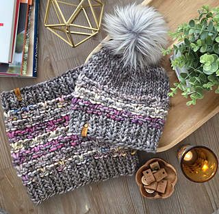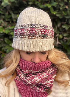Beanie pattern is for a one-size-fits-most unisex beanie with single or folded brim that knits up in a couple of hours for super bulky and not much longer for bulky. Cowl pattern has no shaping at all. Both are worked in the round from the bottom up, with a 4-stitch repeat over 4 rounds creating the color bands. With so many color options, each item can be as unique as you want it to be!