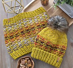The Urban Plaid Beanie and Cowl pattern is a fun, easy, rhythmic and almost mindless knit that is perfect for using up your odds and ends! With a main color and contrasting color bands in bulky or super bulky weight, you can make them as colorful or monochromatic as you want. It’s so quick, it’s perfect for market prep and gifting. So start turning those scraps into something pretty and practical now!