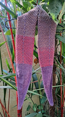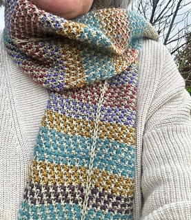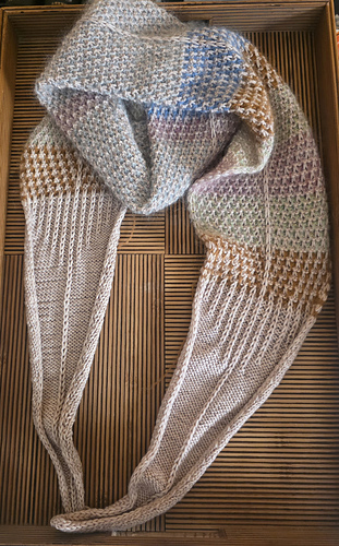 L’écharpe V est la petite sœur des chaussettes V. Amusez-vous avec vos restes de mohair ou de laine fingering pour créer vos propres rayures uniques. Tricotée d’abord à plat, puis en rond, et enfin à nouveau à plat. Le jacquard est réalisé entièrement avec des mailles glissées.