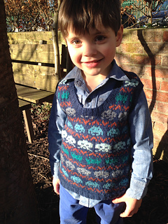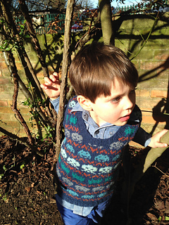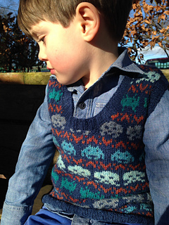 The tank top (vest) is knitted in the round to the armholes, then front and back are knitted flat in rows. The shoulders are gently shaped with short rows, and front and back are finished with a three-needle bind off at the shoulder. The tank top (vest) is completed with ribbing around armholes and neckline.