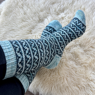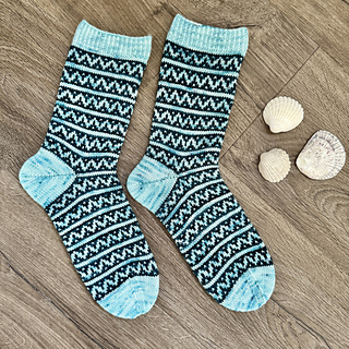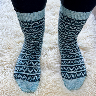 Sockan Vågstänk stickas med sockgarn som bör ligga på ca 360-420 m/100 g. Rekommenderade stickor är 2,0 mm till resåren och 2,5 mm till resten av sockan. Gör en provlopp för att se vilken stickfasthet du får. Längden på sockan kan justeras genom att lägga till eller ta bort mönsterrapporter. Hälen stickas med förkortade varv, så du slipper plocka upp maskor. Garnåtgång är ca 50 g av färg 1 och 40 g av färg 2, men skaftet kan göras kortare om du vill minska garnåtgången. Tagga mig gärna om du stickar sockorna. Det är så roligt att se olika färgkombinationer och uttryck!