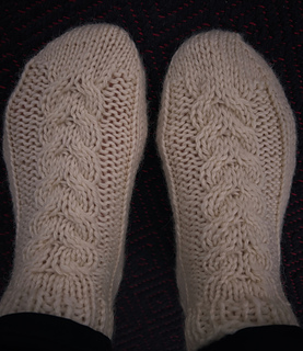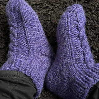 Vålådalen Slippers is a warm and cosy slipper perfect for your stay at home evenings in winter. It’s knitted from the toe and up, with a simple cable pattern on the top of the foot, a short row heel and a short cuff in rib.