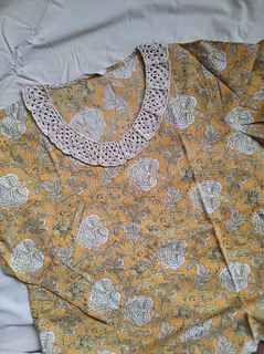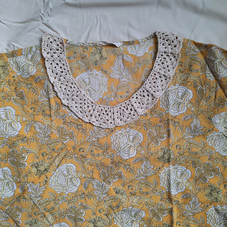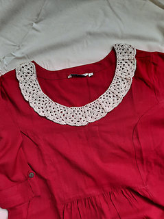 The collar can be made with any yarn but looks best when made with a thinner yarn. The sample was made with no.10 thread. The finished collar is about 43 cms (17”) along the inner side. It can be made in one or more colours. Using a different yarn and suitable hook will change the size of the collar.