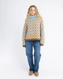 Varde means Cairn and is a straight fit sweater with a turtleneck and a unique colorwork. The bright colors and repetitive pattern makes it the perfect statement sweater for after ski, camp fires or city strolls. This sweater also comes in a crewneck variant.