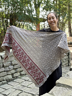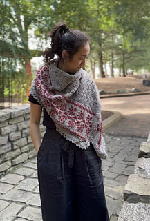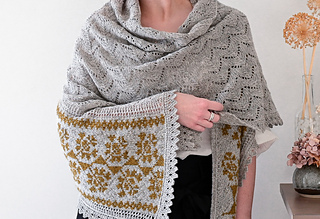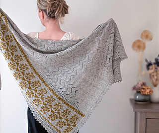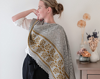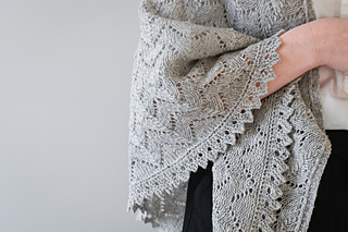 ショールは非対称の三角形で, 頂点から左端に沿って増目しながら編み進める. 編み込みパネルと2辺に沿って編む細いレース飾りが特徴. 本体はMCでリズミカルなレース模様を編み. 仕上げにMCでレースのエッジを編む. レースのエッジは最初に針に掛かった目に沿って編み, 次に編み込みパネルに沿って目を拾い, ショールの頂点 (開始位置) まで続けて編む.