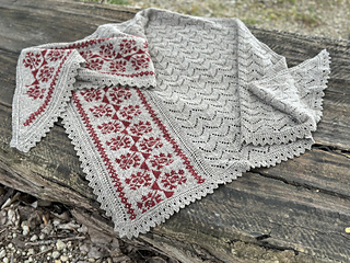 Shawl has an asymmetrical triangle shape and is worked sideways from tip with regular side increases along its left edge. It features a stranded colorwork panel with narrow lace columns along its sides. Main body is knit in MC in a rhythmic lace pattern. Shawl is finished with an applied lace edge in MC worked first along the live stitches and then stitches along the colorwork panel are picked up to continue working applied lace edge to the very tip (starting point) of the shawl.