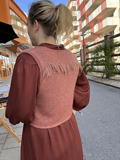 Västen kan stickas med eller utan fransar. Det finns ett diagram med aviga maskor som kan stickas över bakstycket. Diagrammet utgör en snygg detalj även om du skulle välja att låta bli att sätta fransar i de aviga maskorna.