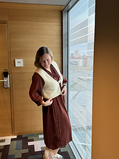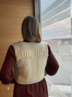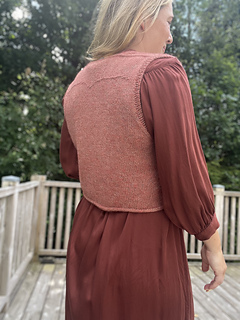 Västen stickas uppifrån och ner med två trådar. Du börjar genom att lägga upp en i-cord som det sen plockas upp maskor i till bakstycket. Efter att bakstycket stickats färdigt stickas höger och vänster axelparti med förkortade varv och ökningar mot halsringningen.