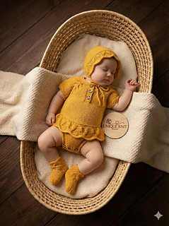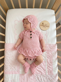 A beautiful 3 piece Romper set knitted with a frilly peplum . The romper is knitted from the top down in one piece.