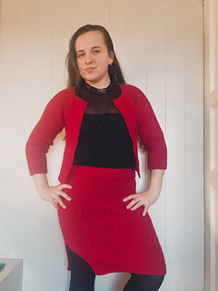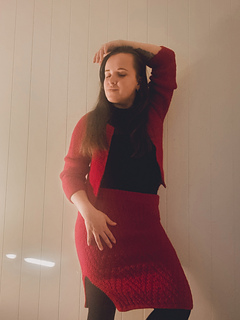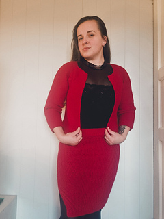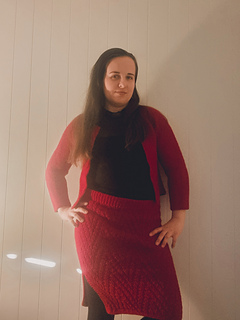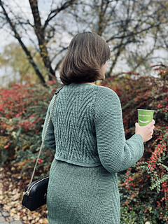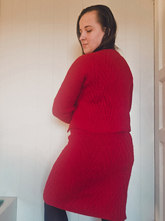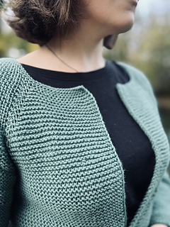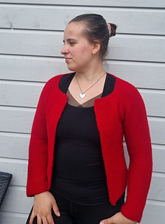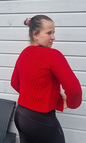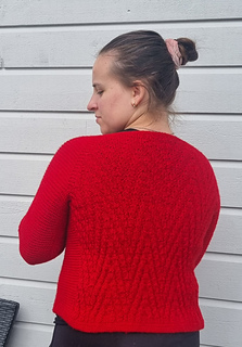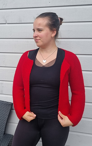 Fordelen med det strukturerte mønsteret som brukes, er at stoffet er tøyelig, noe som gir jakken en veldig tettsittende passform. Derfor kan den virke altfor liten når man strikker!