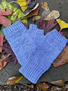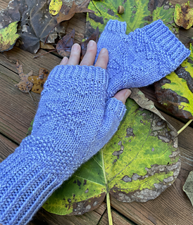 The mitts are worked in the round and incorporate textured patterning and a relief stitch star on the top of the hand.