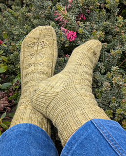 The instructions for the construction of the socks are written and the central panel is both charted and written.