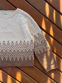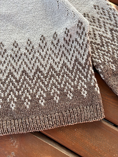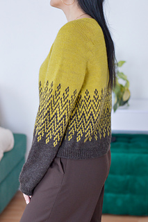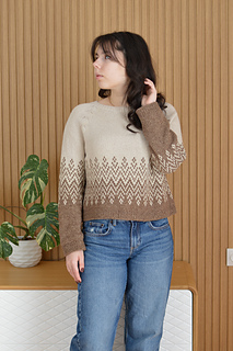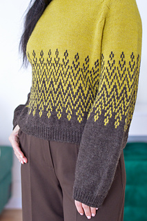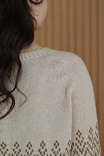 The Veres Sweater is worked from top down with reglan increases on the yoke. The neck edge is worked in rib. Short rows are worked on the yoke to shape the neckline.